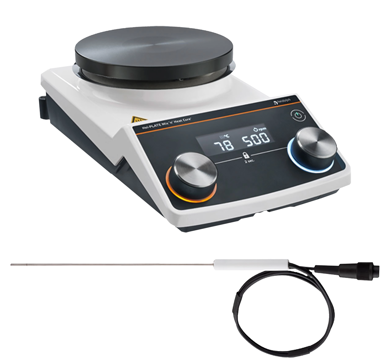 • den Magnetrührer Hei-PLATE Mix 'n' Heat Core+ (145 mm Durchmesser) - Schnell und präzise heizen - ohne Überschwinger - für probenschonendes Arbeiten